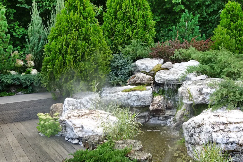 You’ll need more than a few boulders for this one, soil preparation for the plants, and big green shrubs. You can also scatter flowers for color if you want.